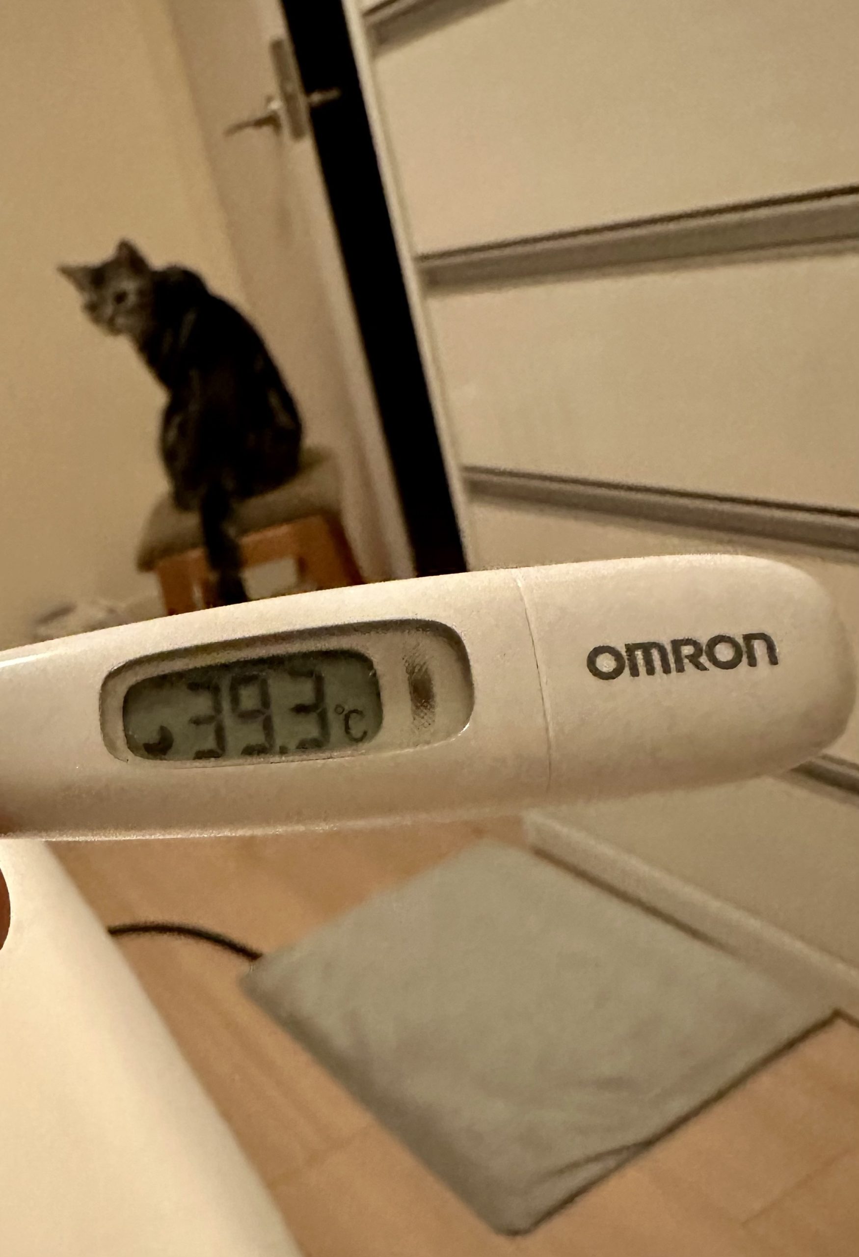 さて飼い主が高熱を出していると、タダならぬ雰囲気を察知したのか珍しく猫が部屋に来て大人しくしています。この後、グレーのホットカーペットの上で大人しくずっと見守ってくれていたので、「なんて賢い猫なんだ、しんどいのを分かって心配してくれるんだ!」と感激したのですが・・・・・・それは熱にうなされた錯覚でした。この後、夜中にお腹が空いて大騒ぎされました。